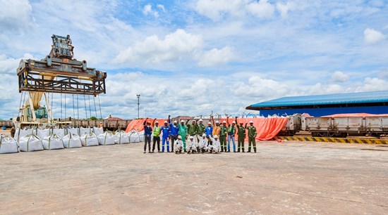 Des ouvriers célèbrent le premier chargement du concentré de cuivre de Kamoa-Kakula à l'entrepôt d'Impala Terminals, à Kolwezi. Le concentré a été mis en sac dans des sacs de 2 tonnes à Kamoa-Kakula et transporté par camion sur 50 kilomètres jusqu'à l'entrepôt d'Impala Terminals avant d'être chargé.