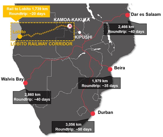 Actuellement, Kamoa-Kakula transporte ses concentrés de cuivre par route à travers l'Afrique subsaharienne vers les ports de Durban en Afrique du Sud et de Dar es Salaam en Tanzanie, ainsi que de Beira au Mozambique et de Walvis Bay en Namibie. En 2023, environ 90 % des concentrés de Kamoa-Kakula ont été expédiés à des clients internationaux depuis les ports de Durban et de Dar es Salaam, où un aller-retour prend en moyenne entre 40 et 50 jours environ. La distance entre Kamoa-Kakula et le port de Lobito est environ la moitié de celle du port de Durban (voir Figure 1), et le transport ferroviaire est à la fois plus rapide et nettement moins gourmand en énergie.