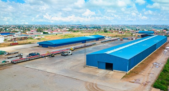 Vue aérienne des entrepôts d'Impala Terminals à Kolwezi, où ont eu lieu le stockage et le chargement du concentré de cuivre de Kamoa-Kakula pour l'expédition d'essai. Il est prévu de construire un embranchement ferroviaire reliant le corridor ferroviaire de Lobito à Kolwezi à Kamoa-Kakula, afin que les futurs chargements puissent avoir lieu sur place (comme le montre la figure 2).