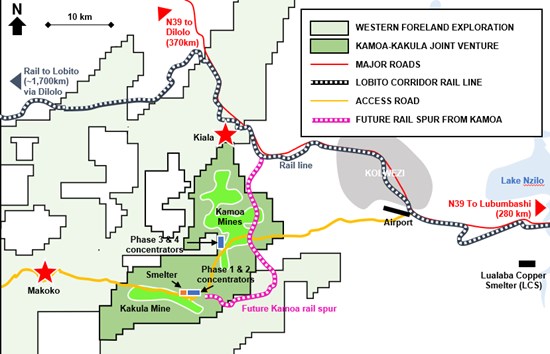 Figure 2. Carte des licences Kamoa-Kakula et Western Foreland, des infrastructures routières et ferroviaires locales existantes, ainsi que du futur embranchement ferroviaire prévu reliant le corridor ferroviaire de Lobito à Kamoa-Kakula.