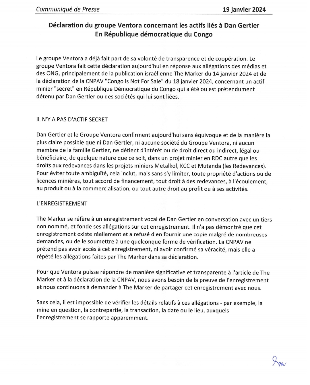Le groupe Ventora dément les révélations de TheMarker, le quotidien économique en langue hébraïque, sur l'existence d'un actif minier secret en République démocratique du Congo estimé à 1,5 milliards $ appartenant à Dan Gertler. Dans un communiqué publié ce vendredi 19 janvier, le groupe Ventora précise que ni Dan Gertler, ni aucune société du Groupe Ventora, ni aucun membre de la famille Gertler, ne détient d'intérêt ou de droit direct ou indirect, légal ou bénéficiaire, de quelque nature que ce soit, dans un projet minier en RDC autre que les droits aux redevances dans les projets miniers Metalkol, KCC et Mutanda (les Redevances).