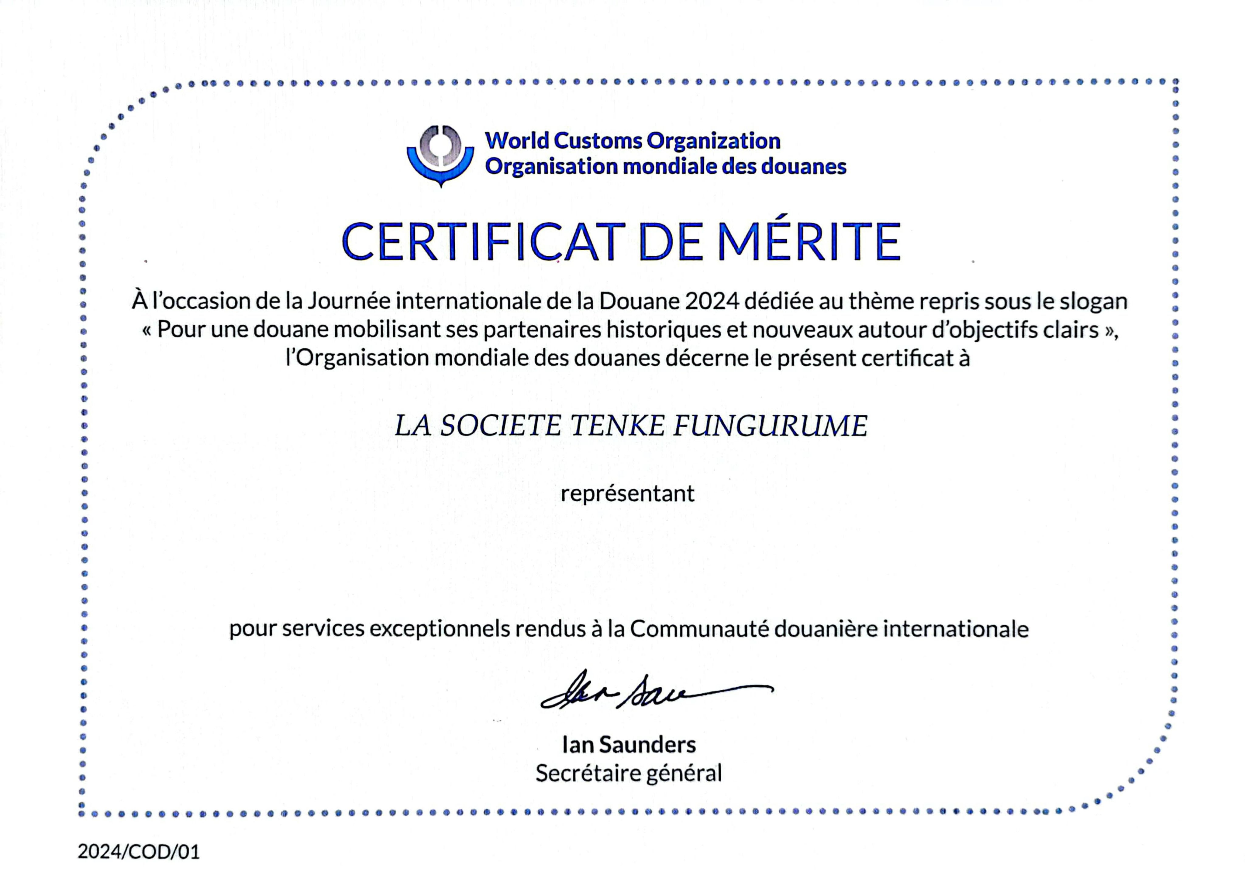 Cette contribution fait de TFM l'un des plus grands contributeurs de droits et taxes dans le pays. En reconnaissance de ses services "exceptionnels" à la communauté douanière internationale, TFM s'est vu décerner un certificat de mérite par l'Organisation mondiale des douanes (OMD), soulignant son rôle de principal contributeur en termes de droits et taxes en 2023.