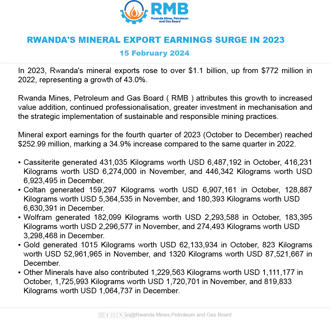 Dans un communiqué publié jeudi 16 février, l'Office rwandais des mines, du pétrole et du gaz (RMB) informe qu'en 2023 les exportations de minéraux du Rwanda ont atteint plus de 1,1 milliard de dollars, contre 772 millions de dollars en 2022, soit une croissance de 43,0%.