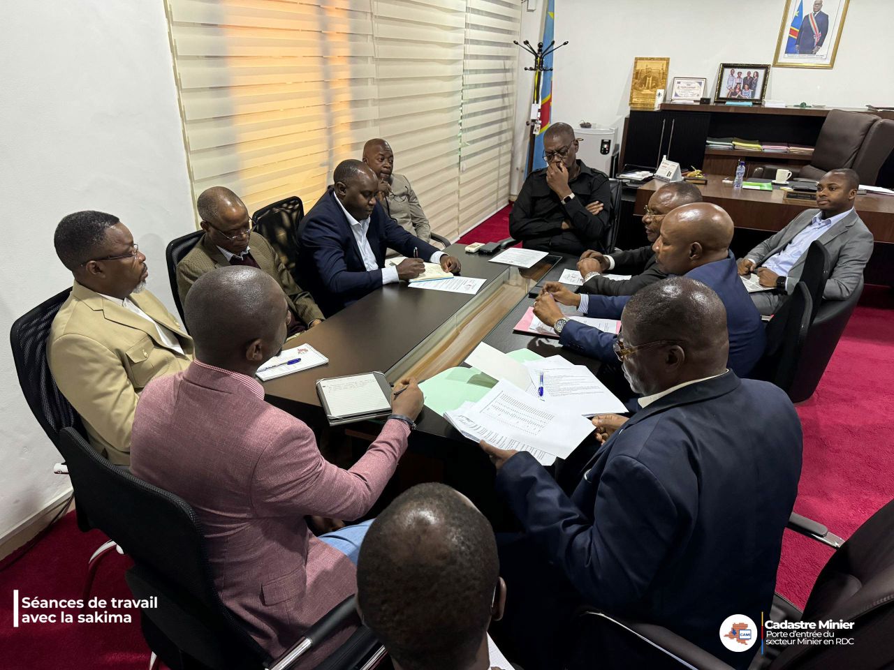 Le Directeur Général du Cadastre minier, Popol Mabolia Yenga, a échangé tour à tour avec les représentants de la GECAMINES, suivis par ceux de la SAKIMA, de la MIBA et enfin ceux de la COMINIERE ce vendredi 26 avril 2024, autour des problématiques liées à la création des droits miniers et des carrières pour tous les rejets des mines des sociétés minières du Portefeuille de l’État en vue de leur valorisation, eu égard d'importantes avancées réalisées.
